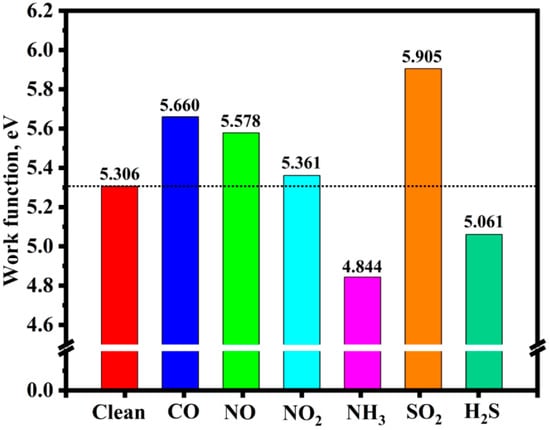 Figure 9 illustrates the band structures of the Ni-InSe monolayer upon the adsorption of various toxic gases. It is evident that the adsorption of CO, NO, and SO2 causes the bandgap of the Ni-InSe monolayer to vary from 1.196 eV to 1.419 eV, 1.323 eV, and 1.332 eV, respectively. The extent of change in the bandgap follows the order, CO (18.65%) > SO2 (11.37%) > NO (10.62%), indicating that the Ni-InSe monolayer is highly sensitive to these three gases. In contrast, the bandgap diminishes to 0.816 eV, 1.142 eV, and 1.190 eV for the adsorption of NO2, NH3, and H2S, respectively. It is apparent that the NH3/Ni-InSe and H2S/Ni-InSe systems demonstrate minimal rates of change in the bandgap, with respective values of −4.52% and −0.50%. Nevertheless, the Ni-InSe monolayer displays the highest sensitivity towards NO2 due to the most substantial rate of change in the bandgap (−31.77%). Consequently, it can be concluded that the Ni-InSe-based gas sensor exhibits a superior sensitivity toward CO, SO2, NO, and NO2. In addition, the work function (Φ) can also serve as an evaluative measure of the gas sensor sensitivity, which is defined as follows []: , where and are the vacuum level and Fermi level of a system, respectively. The work functions of the pristine Ni-InSe monolayer and various adsorption systems are presented in Figure 10. It is observable that the adsorption of NH3 and H2S results in a reduction in the bandgap of Ni-InSe, while the adsorption of other gases leads to an increase in the bandgap of Ni-InSe. The rate of change in the work function follows the sequence, SO2 (11.29%) > NH3 (−8.72%) >CO (6.67%) > NO (5.13%) > H2S (−4.61%) > SO2 (1.03%), suggesting that the Ni-InSe monolayer can function as an Φ-type gas sensor for SO2, NH3, and CO.