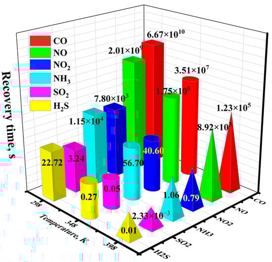 Generally, a favorable recovery characteristic is essential for gas sensors with high performance. In simulation calculations, the recovery process is considered as the reverse process of adsorption. According to the transition state theory and the Van’t Hoff Arrhenius expression, the recovery time (τ) can be calculated using the following equation []: