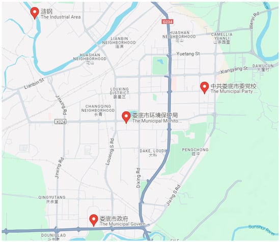 Four high-capacity air samplers were used to simultaneously collect PM10 samples at four locations in Loudi City, China, including the Lian-Gang steel industry (LG1-LG5), the municipal government (MG1-MG5), the municipal monitoring station (MS1-MS5), and the municipal party school (MP1-MP5). The sampling time for each sample was 24 h, and the collected PM10 samples were adsorbed on quartz fiber filter membranes with a diameter of 80 mm (Qingdao Jinghong Environmental Protection Technology Company). The four sampling locations are shown in Figure 1. Five PM10 samples were collected at each location during a sampling period. Forty PM10 samples were collected in two different seasons, including Spring and Winter, as PM10 sample set 1 and sample set 2, respectively. The weight of these prepared samples was accurately measured, and they were stored in pre-drying bags at suitable temperature conditions (−20 °C) for further analysis.