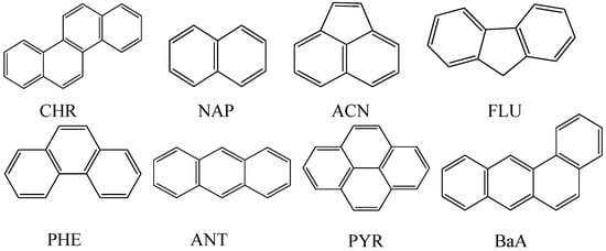 The eight PAHs included acenaphthylene (ACN, analytical standard), fluorene (FLU, ≥99.5%), phenanthrene (PHE, analytical standard, ≥99%), anthracene (ANT, ≥99.5%), pyrene (PYR, analytical standard), benzo[α]-anthracene (BaA, analytical standard), chrysene (CHR, ≥97%), and naphthalene (NAP, ≥99.7%), which were supplied by Aladdin Biochemical Technology Co., Ltd. (Shanghai, China). Methanol (HPLC grade, 99.9%) was also obtained from Aladdin Biochemical Technology Co., Ltd. Other solvents, including dichloromethane (Analytical reagent (AR), ≥99.5%) and n-hexane (AR, ≥97.0%), were sourced from Hunan Hui-hong Reagent Co., Ltd. (Changsha, China).