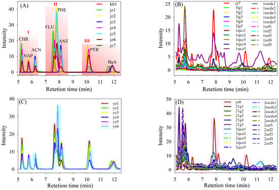 Chromatograms of all samples. (A) Seven calibration samples and one blank sample; (B) PM10 samples in sample set 1; (C) six validation samples; (D) PM10 samples in sample set 2.