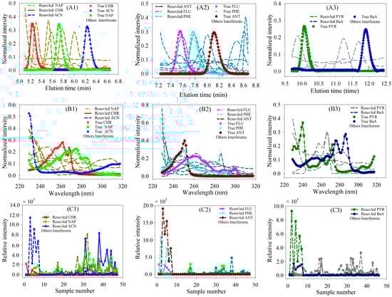 Figure 4 presents the chromatographic, spectral, and relative concentration profiles of the eight PAHs in 7 calibration samples and 40 PM10 samples. As shown in Figure 4A1–A3, the baseline drift was successfully eliminated as an additional factor. Among them, ANT, FLU, and PHE eluted very close to each other and seriously overlapped within 1.40 min. This is because their molecular structures are very similar, even when they are isomers such as PHE and ANT. Additionally, the issue of slight retention-time shifts, especially for PYR and BaA, was also successfully addressed with the proposed method.