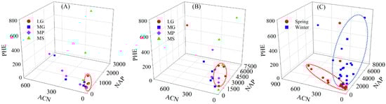 Classification of PM10 samples based on the relative concentrations of NAP vs. ACN vs. PHE at four sites in a city. (A) for sample set 1; (B) for sample set 2. (C) for sample sets 1 and 2. For (A,B), the cluster within the red dotted circle is mainly PM10 from LG. For (C), the red and blue circles for the clusters of PM10 collected during Spring and Winter, respectively.