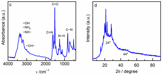 In accordance with the XRD pattern of carbon nanoparticles, a broad band, typical of an amorphous structure, with maxima at approximately 24° and 44° were observed (Figure 1d) that correspond to the (002) plane of graphitic carbon and (100) crystal planes, determining the longitudinal dimension of the structural elements (powder diffraction file No. 65.6212) [56,57,58]. Furthermore, the pattern displays a number of distinct narrow peaks superimposed upon the broad band. These peaks are associated with large-sized crystals, as predicted by the Scherrer equation, with a full width at half maximum (FWHM) of 0.1–0.3°. As evidenced by the SEM images, the particles can form ordered crystals.
