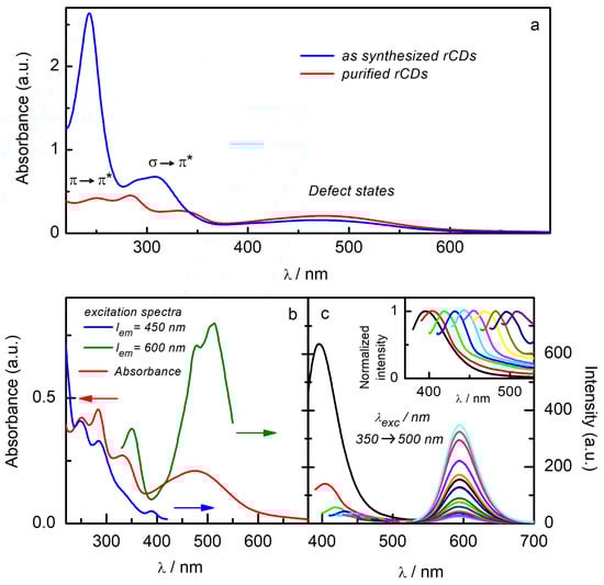 Absorption and photoluminescent spectra of rCDs. (a) UV-visible spectra before and after the purification process. (b) Excitation spectrum by emission at 450 (blue) and 600 nm (green) superposed with UV-visible spectra (red) (The arrow to the left indicates the absorbance axis and to the right the intensity axis to be considered for each spectrum). (c) Emission spectra at different excitation wavelengths. Inset: normalized spectra obtained by excitation from 350 to 450 nm; only the spectral region of 370 to 530 nm is shown for clarity. The emission spectra were acquired at incremental values of 10 nm of excitation wavelengths. All the spectra have been recorded in ethanol solutions.