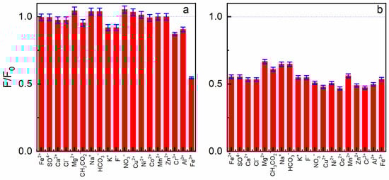 To ascertain if this sensory ability is accompanied by selectivity, a study of the behavior of the emission at 600 nm in the presence of different ions has been performed. Figure 5a shows the ratio of fluorescence intensity obtained after the addition of other ions to the rCD solution and Figure 5b to the rCD solution in the presence of Fe(III) ions. As can be observed, the analyzed ions (Fe2+, SO42− Ca2+, Cl−, Mg2+, CH3COO−, Na+, HCO3−, K+, F−, Co2+, NO3−, Cu2+, Ni2+, Mn2+, Zn2+, Cr3+, Al3+), which were tested by adding 50 μM of each ion to the rCD solution under the same conditions as the Fe(III) experiment do not show any quenching effect. Moreover, the addition of these ions to the already quenched system, that is, the rCDs-Fe(III) system, has no noticeable effect on the detection capacity of the developed rCDs (Figure 5b), demonstrating that only Fe(III) is capable of reducing fluorescence.