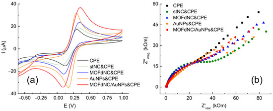 Electrochemical impedance spectroscopy measurements were conducted to study the interface properties of electrode surfaces. The electron transfer kinetics of [Fe(CN)6]3−/4− at pristine and different modified electrodes revealed a typical Nyquist plot, as can be seen in Figure 2b. All obtained EIS curves include a semicircle part at high frequencies that corresponds to the electron transfer limited process consistent with charge transfer resistance. The results demonstrated that modified electrodes possess smaller semicircles compared with pristine CPE, and the best electrochemical properties and promotion of the electron transfer process were spotted at MOF-derived nanoceria functionalized with gold nanospheres, corresponding to previously considered CV data.