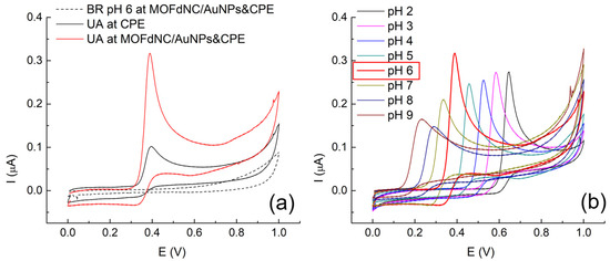 (a) CV profiles of 20 µM of UA at pristine and MOFdNC/AuNP-modified CPE in BR buffer at pH 6. (b) Effect of pH on CV profiles at MOFdNC/AuNPs&CPE (scan rate of 100 mV/s).