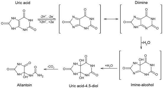 The slope of 58 mV/pH showed that the electrochemical oxidation of UA followed the Nernst equation. This suggests that the electrode process involved an equal number of protons and electrons included in the electrode reaction process (two protons and two electrons in the first step of the overall electrochemical reaction, which is in agreement with previous reports [15,36,37,38]). According to [39,40], the electro-oxidation pathway of uric acid occurred through the exchange of two protons and electrons and forming diamine in the transition state, which further successively absorbed two molecules of water to form imine-alcohol and uric acid-4,5-diol. In natural pH, this compound can be decomposed on allantoin and CO2. The proposed electrochemical reaction mechanism of UA oxidation is given in Figure 4.