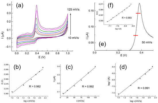 The oxidation mechanism at MOFdNC/AuNPs&CPE was examined by recording cyclic voltammograms of 20 µM of uric acid in BR buffer, pH 6, applying scan rates of 10, 15, 25, 50, 75, 100, and 125 mV/s (Figure 5a). In this figure, it is evident that the peak current increased with an increasing scan rate and the peak potential (Ep) was slightly shifted to positive potentials. The irreversibility of the reaction was confirmed by the linear plot of Ep vs. the logarithm of the scan rate (Figure 5b), described by regression equation Ep (V) = 0.336 + 0.025 log v (mV/s) (R = 0.990). The linear relationship between the peak current and scan rate is shown in Figure 5c, with the corresponding fitting equation I (A) = −4.43 × 10−8 + 2.76×10−9 × v (mV/s); (R = 0.992). This linearity between I and v indicated that an absorption-controlled process occurred at the electrode surface. The linear plot log I vs. log v, fitted by the formula log I (A) = − 8.01 + 0.81 × log v (V/s); (R = 0.991), is given in Figure 5d. The slope of 0.81 indicates the predominance of absorption over diffusion at the electrode surface, bearing in mind that the theoretical value for the fully absorption-controlled process is 1.0 [41].
