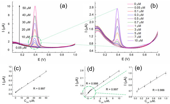 Under the optimized experimental conditions and parameters of the technique (Figure S3), the SW voltammograms of different concentrations (0, 0.05, 0.1, 0.3, 0.5, 0.7, 1, 3, 5, 7, 10, 20, 30, 40, 50 µM) of uric acid were recorded at the proposed modified electrode and voltammetric profiles of whole investigated range (Figure 6a,b). The linearity of the data was observed for the range of higher concentrations from 1 to 50 µM and for the range of lower concentrations from 0,05 to 1 µM. The corresponding calibration curves are given below for SWVs (Figure 6c,d), while in Figure 6e, the lower concentration range is presented in better resolution. The distinct oxidation peak was recorded at 0.39 V with a proportional increase in the current response as the concentration of uric acid increased, and it was applied for quantitative determination. At the same time, no changes in the peak potentials were observed, additionally confirming excellent electrocatalytic performances of the proposed sensor. The equations that describe linearity in calibration curves are as follows: