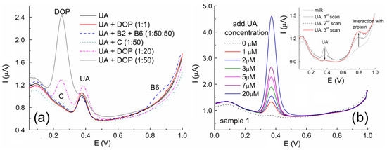 Although this selectivity study suggested the possibility of the successful determination of UA in body fluids by the proposed sensor, we decided to investigate the possibility of applying this sensor in the milk sample because electrochemical UA sensors are rarely used in these samples [6,8,47,48]. Uric acid is one of the main antioxidant biomarkers found in milk [49], and the concentration of this compound was found to be connected with milk spoilage [6]. First, the interfering effect of some ions and biocompounds that can be found in milk was investigated. According to the results obtained, fructose, glucose, lactose, citric acid, folic acid, and Mg2+, Na+, Ca2+, NH4+, F−, Cl−, SO42−, and NO3− in 100-fold excess also did not interfere with the determination of uric acid, suggesting the possibility of successful analysis of milk samples. Two samples of pasteurized milk were investigated by the developed analytical procedure and sensor. Figure 7b shows the SWV of prepared milk sample 1 (S1) in BR buffer at pH 6 and the SWVs of the samples prepared with spiking. As can be seen in the inset graph, determining UA concentration by spiking an unprepared milk sample was impossible because of the interaction between the added UA and the proteins present in milk, as they can reduce the concentration of uric acid [50]. The peak current proportional to the concentration of UA decreased with the addition of UA and repeated measurements with the same concentration, while the peak at 0.8 V increased rapidly. After removing the protein fraction (Section 2.5), the determination of UA in the treated milk samples was successfully performed and correlated with comparative spectrophotometric measurements (Table 2).