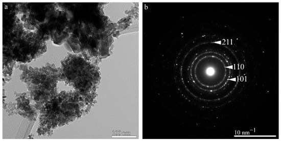 The structure of the sample was determined using selected area electron diffraction (SAED). The SAED pattern shown in Figure 3b is typical for a polycrystalline material, and it reveals the tetragonal structure of SnO2, with the space group P42/mnm. The white arrows are pointing towards crystallographic planes (110), (101), and (211), as indexed according to cif no. 2104754 from COD database.