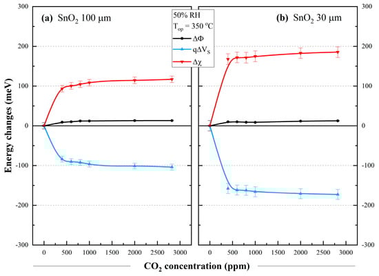 CO2 influence over the potential changes: SnO2 100 µm (a) and SnO2 30 µm (b) for Top = 350 °C and 50% RH.