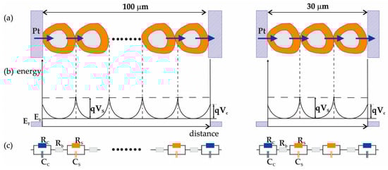 The first hypothesis is supported by the geometrical approach of a SnO2 polycrystalline sensitive material, considering incompletely depleted grains, arranged between Pt electrodes with interdigital gaps (L) of 100 and 30 µm (Figure 8a). The so-called surface state model [28] was used to represent the surface and bulk energetic dependencies with respect to the percolation path phase of the electric current (Figure 8b).