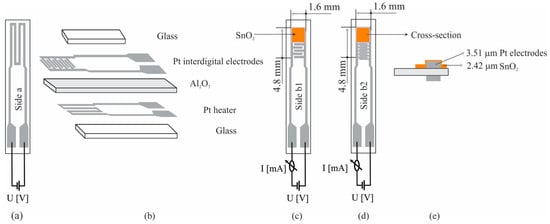Planar substrate sensor overview. Side a represents the Pt heater meander (a) and sensor components parts (b); Side b1 represents the interdigital electrodes with a 100 μm gap (c); Side b2 represents the interdigital electrodes with a 30 μm gap (d) and a cross-section of the sensor (e).