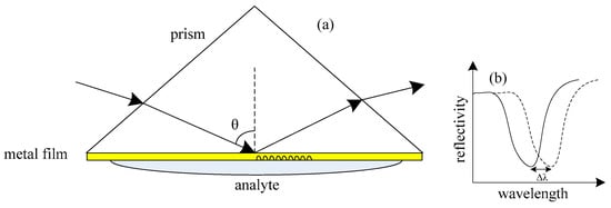 An optical wave couples to the SPW (surface plasmon wave) of the metal with a prism by the attenuated total reflection (ATR) method [20]. The optical wave is totally reflected at the interface between the prism and the metal film and then evanescently penetrates through the metal film and excites the SPW at the interface between the metal film and the analyte, as shown in Figure 1a. The SPR leads to a drop in the intensity of the reflected light, which could be measured as a valley in the wavelength spectrum. The RI of the analyte would be obtained by detecting the wavelength of the valley, which is known as the wavelength interrogation method, as shown in Figure 1b.