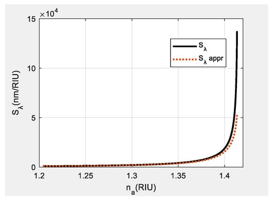 and Equation (3) agrees well with Equation (2) when the RI of the analyte is less than 1.40 RIU, as shown in Figure 2, so Equation (3) is used in the following analysis.