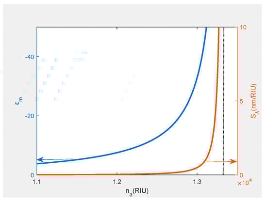 The maximum of the refractive index of the analyte is supposed to be known, and then the spectral sensitivity could be enhanced by arranging the effective RI of the incident light to be a little larger than the maximum of the RI of the analyte, leading to the denominator approximating zero and/or adopting prisms with large RI values, resulting in a larger numerator, according to Equation (5). The large dielectric permittivity of the SPR active materials is one of the key points regarding high spectral sensitivity. Only a large dielectric permittivity could satisfy the coupling condition of SPR according to Equation (1) when the effective RI of the incident light is posited a little larger than the maximum of the RI of the analyte to increase the spectral sensitivity, as plotted in Figure 4, where the high spectral sensitivity is accompanied with the large dielectric permittivity of the SPR active materials. The effective RI of the incident light and the derivation of the dielectric permittivity of the SPR active material to the wavelength are set at 1.3347 (the dotted line) and −0.2 /nm, respectively, in Figure 4. The result is consistent with the previous reports that prism-based SPR sensors have large spectral sensitivity at a long wavelength [3,4,6,10,12] since metals have large dielectric permittivity at a long wavelength.