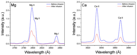 In Figure 3, the lines from Table 1 are plotted in detail for the pre-processed LIBS spectra measured before and after the infusion. The spectral lines were fit with a Gaussian function (mainly due to the instrumental profile) to get their net intensities, given by the integrated areas of the line profiles after subtracting the background baseline. Then, the net intensities of all the analytical lines corresponding to the same macronutrients were added to obtain their total intensity of emission.