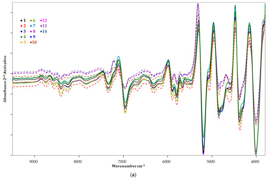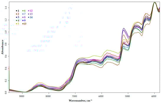 The raw spectra of the dried, ground 13 cultivars of Pleurotus ostreatus are shown in Figure 1. The figure shows a narrowed range (9000–3800 cm−1), since the wavenumber range 12,500–9500 cm−1 has no evaluable region. The spectra structure correlations in the 7500–4300 cm−1 region are presented in Table 2.