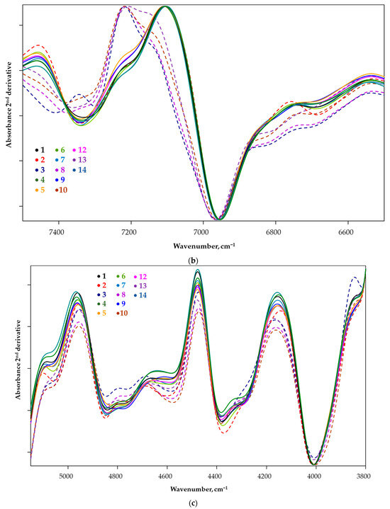 Differences in the shape of the spectra can already be seen in this figure. This difference is clearly visible in the first, but even more pronounced in the second derivative spectral image (Figure 2a). In Figure 2b,c, the ranges showing the typical differences are zoomed in.