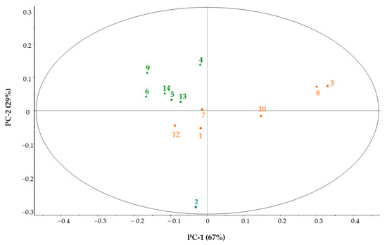 The polyphenol data were normalised before PCA (Figure 3), since the data values for some components differed by an order of magnitude from the others. Based on Figure 3, groups can be clearly distinguished, but the composition of the groups differs from the group recognition based on the spectral data.