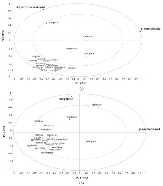 It can be concluded that 4-hydroxibenzoic acid, p-coumaric acid and hesperetin are mainly responsible for the variance. The polyphenolic components located in the area between the two ellipses have a smaller but not negligible effect.