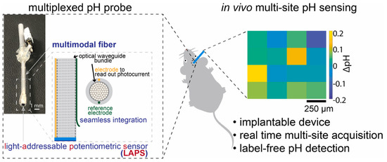 A miniaturized probe to be inserted into the brain for in vivo pH imaging [39]. A tiny LAPS chip with dimensions of 1 × 1 mm2 is attached at the end of an optical fiber bundle fabricated by a thermal drawing process. A Cu wire to contact the backside electrode of the LAPS chip and an Ag wire to be used in an Ag/AgCl pseudo reference electrode are also integrated into the bundle. The backside of the LAPS chip is illuminated by a plurality of light beams that are modulated at different frequencies and delivered by the optical fiber bundle. These light beams illuminate different locations of the LAPS chip and generate photocurrents depending on the local pH values. The measured photocurrent signal is the sum of these components, which can be separated in the frequency domain to generate a two-dimensional pH map. Reproduced with permission from [39]. Copyright 2021, Elsevier.