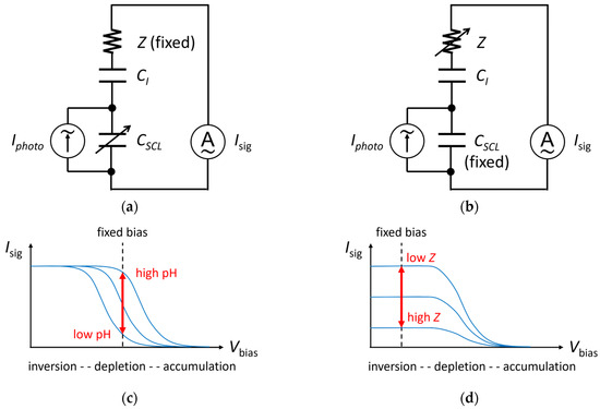 Krause et al. [19,40] proposed yet another modality of measurement, scanning photo-induced impedance microscopy (SPIM), based on essentially the same device structure as that of a LAPS. Whereas the LAPS and the chemical imaging sensor respond to the variation in the surface potential, which is a function of the activity of the target species, SPIM responds to the impedance on the sensing surface and generates a spatial map of impedance. Figure 8 compares the simplified circuit models for alternating currents and the Isig−Vbias characteristics of the LAPS (Figure 8a,c) and SPIM (Figure 8b,d).