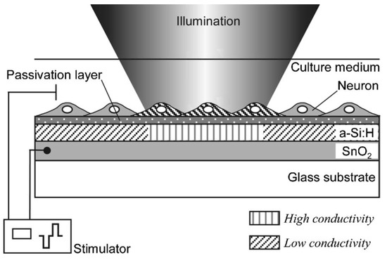As an alternative to an MEA, a light-addressable electrode (LAE) [15,46] was developed and was mainly aimed at stimulating and probing cultured neurons in a spatially resolved manner. Compared with an MEA, in which the size of electrodes and their positions are pre-defined, an arbitrary area on the LAE surface can be activated by illumination. The basic concept of such a system can be found, for example, in the patent application filed in 1995 by Sugihara et al. [47], but various implementations have been proposed to date. In most LAEs, photocarriers are excited by illuminating a semiconductor layer, and an electrical pathway is created to access the particular neuron on the surface. Bucher et al. [16] inserted an underlying a-Si:H layer beneath an MEA and utilized the photoconductivity of a-Si:H to select individual electrodes in the array. Colicos et al. [17] cultured neurons on a Si surface, and only the neuronal cell body of interest was illuminated under the microscope to enhance the conductivity of Si directly under the selected neuron. An electrical pulse was then exclusively applied to the selected neuron through the region of enhanced conductivity, which functioned as a virtual probe. Starovoytov et al. [18] also cultured neurons on a Si surface, and extracellular stimulation was realized by generating an electrical current near the neuron via a pulsed illumination under a constant bias condition. Suzurikawa et al. [15] cultured neurons on a layered structure, as shown in Figure 11, which consisted of a passivation layer of zinc antimonate sol and bisphenol-F epoxy resin, a photoconductive layer of a-Si:H, and a conductive layer of SnO2 deposited on a glass substrate. Neurons were cultured on the passivation layer, and a highly conductive region in the a-Si:H layer, defined by illumination, was employed as a virtual probe to electrically stimulate the neurons only inside the illuminated region.