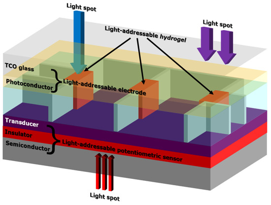 The second possible form using light-addressability is a multi-well, multi-chamber, or multi-channel structure that can accommodate multiple sample solutions, as shown in Figure 4b [35]. In this configuration, the sensing surface of a single sensor plate can be divided into many sensing areas that function as independent sensors, which is advantageous for handling various samples at high throughput. For example, by replacing the bottom of a 96-well plate with the sensing surface of a LAPS, temporal changes in each well, such as those caused by metabolic activities of cells, can be monitored in parallel.