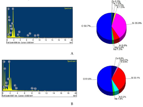 SEM–EDS spectra and atomic weight composition of the Z (A) and Cu–Z (B) samples.