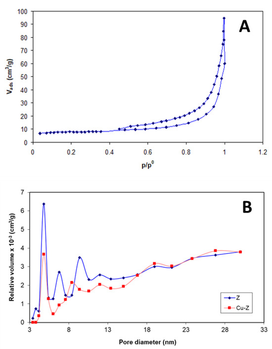 N2 adsorption–desorption isotherm for an unmodified sample, Z (A) and BJH pore size distribution (B) for an unmodified (Z) and Cu-modified sample (Cu–Z).