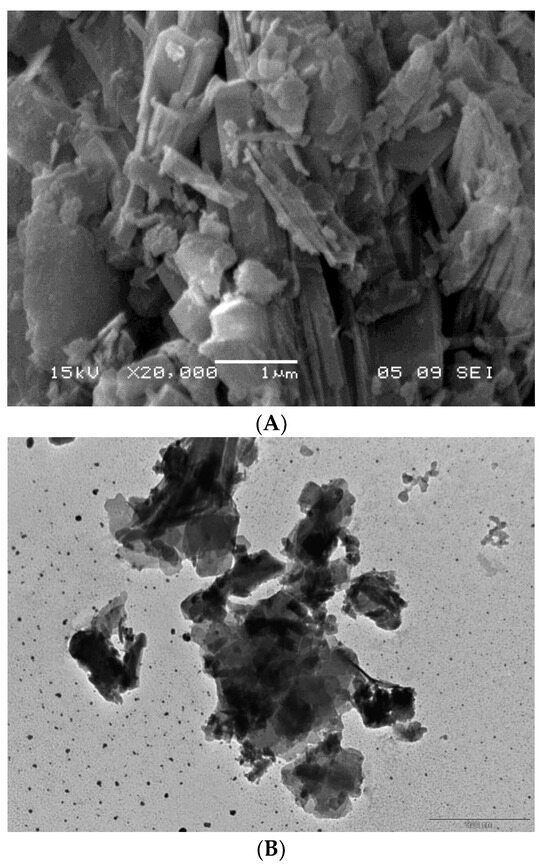 SEM (A) of TEM (B, scale 500 nm) images of the unmodified zeolitic volcanic tuff.