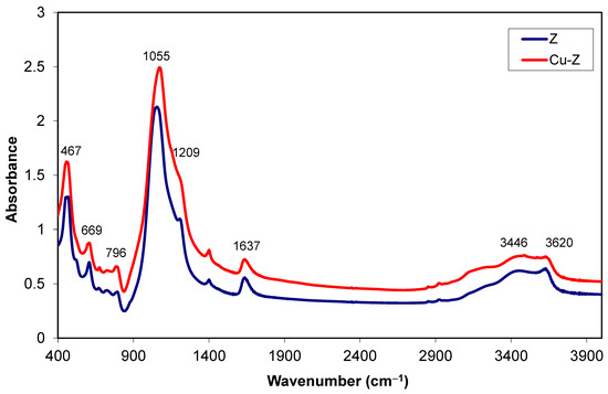 FTIR measurements were also used to characterize the samples of zeolitic volcanic tuff and confirm the presence of clinoptilolite. Spectra of the natural sample (Figure 4) confirmed the presence of specific zeolite peaks, identified in Table 1, in accordance with the literature data [2,52,53,54,55]. For the Cu–Z sample, some minor modifications—specifically, peak shifts (Figure 4)—were observed. This can be attributed to the partial destruction of the zeolite’s three-dimensional structure during the calcination process [2].