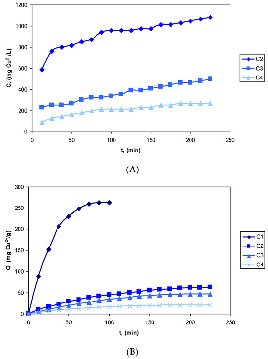 The breakthrough curve (time vs. concentration evolution) and cation exchange capacity during the ionic exchange process and modification of the zeolitic tuff sample, (up to 225 min, 900 mL copper solution) are presented in Figure 5. The cation exchange capacity (“practical capacity” or “operating capacity” obtained under working conditions) [56,57], in mg/g, was calculated by taking into consideration the initial concentration times t concentration and the zeolitic volcanic tuff mass placed in the column. Following the ionic exchange process evolution, shown in Figure 5A, it was observed that as the copper ion initial concentration decreased, the breakthrough curve slope angle was smaller, indicating that the ionic exchange reaction rate decreased and therefore that the ionic exchange capacity had a smaller value; Figure 5B. Additionally, when a concentrated copper ion solution made contact with the zeolitic volcanic tuff, the ionic exchange capacity increased abruptly—up to 262.6 mg/g—showing a high capacity of the sample to retain metal ions when mass transfer conditions are improved. The maximum calculated cation exchange capacity values are presented in Figure 6.