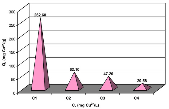 Maximum copper exchange capacity values on the zeolitic volcanic tuff sample; C1 = 16.5 g Cu2+/L, C2 = 1.10 g Cu2+/L, C3 = 0.50 g Cu2+/L, C4 = 0.25 g Cu2+/L.