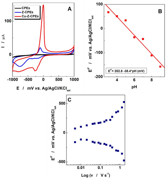 Cyclic voltammograms corresponding to the obtained modified electrodes (A); pH dependence of formal standard potential (B) and experimental dependence of (Ep − E0′) on the logarithm of the scan rate (C) corresponding to Cu–Z–CPEs. Experimental conditions: starting potential,—1000 mV vs. Ag/AgCl/KClsat; scan rate, 10 mV s—1 (A); 50 mV s—1 (B); supporting electrolyte, 0.1 M phosphate buffer solution, pH 7 (A,C).