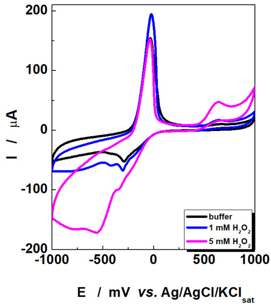 Cyclic voltammograms recorded with Cu–Z–CPE electrodes in 0.1 M phosphate buffer (pH 7.0) and in solution containing two H2O2 concentrations.