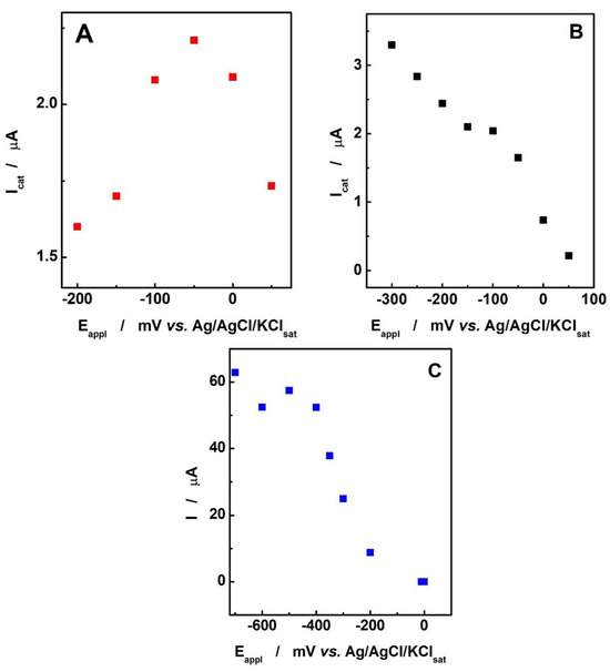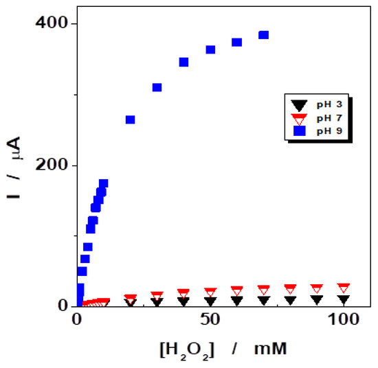 As can be seen in Figure 9A–C, the optimum value of applied potential was −50 mV vs. Ag/AgCl/KClsat for pH 3, −150 mV vs. Ag/AgCl/KClsat for pH 7 and −400 mV vs. Ag/AgCl/KClsat for pH 9. For pH 3, the optimum value of applied potential was chosen as the higher value, while for pH 7 and pH 9, the optimum values were chosen on the plateau of the graph, because after this plateau, the values of the H2O2 electrocatalytic currents dramatically decreased. All these values were used in further electroanalytical measurements.