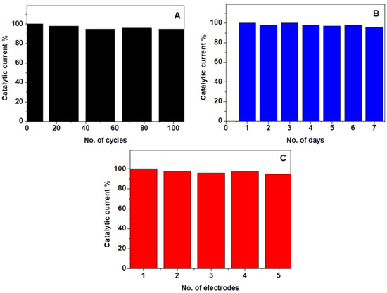 The durability of the H2O2 sensor was studied in different ways, to test their repeatability and reproducibility: (i) The voltammetric response of the modified electrode in the presence of 5 mM H2O2 over 100 cycles (Figure 11A) was tested, as well as the stability of the catalytic current of the modified electrode over 7 days (Figure 11B). In both cases, a decrease of less than 5% of the catalytic current was observed; (ii) Five modified electrodes were tested at the same H2O2 concentration (5 mM) and a small difference between signals occurred (5.4%; Figure 11C).