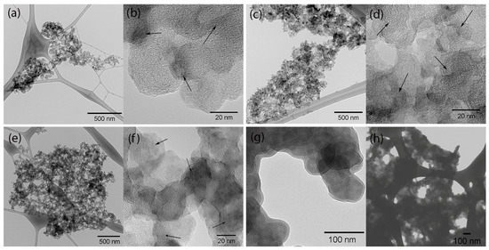 Electron microscopy images of (a,b) CB-PANI.1-1, (c,d) CB-PANI.1-2, (e,f) CB-PANI.1-4, (g) bare CB, and (h) PANI-P1. (Black arrows indicates PANI shell).