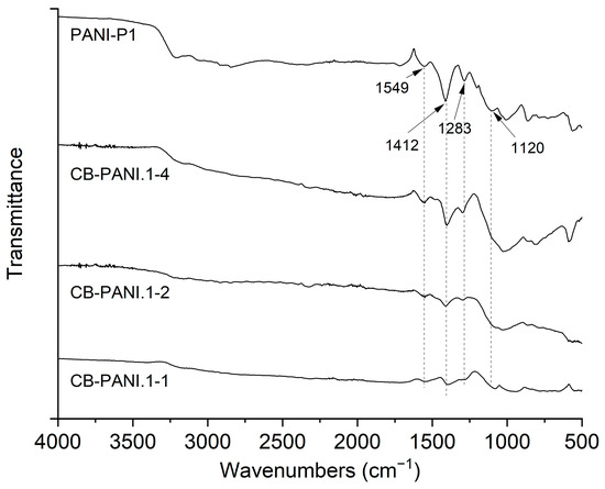 Figure 2 shows the FTIR spectra of the core–shell composites and PANI-P1 as a reference. For simplicity, the spectrum of PANI-P1 is first described. In summary, the spectrum shows the typical absorptions of polyanilines, the most representative being those located between 1200 and 1600 cm−1 [24,25]. Specifically, the absorptions at 1412 cm−1 and 1549 cm−1 are, respectively, ascribed to benzenoid (N-B-N) and quinoid (N=Q=N) ring-stretching vibrations. In addition, the peaks at 1120 cm−1 and 1283 cm−1 are associated with the stretching modes of C–N bands and π-electron delocalization due to protonation, respectively. The most relevant feature of this set of spectra is that the composites show the same signal profile as polyaniline and that the intensity of the signals increases progressively with the P1 content in the polymerization. This indicates that the amount of PANI-P1 increases from CB-PANI.1-1 to CB-PANI.1-4, confirming the trend observed in the electron microscopy images.