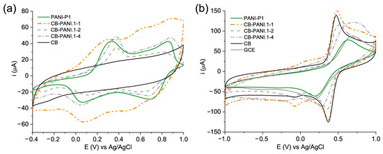 In contrast, its analogs presented behaviors very similar to that of PANI-P1. Figure 3b shows the analysis of the composites, PANI-P1, CB, and GCE in the ferricyanide/ferrocyanide (K4[Fe(CN)6], K3[Fe(CN)6]) redox probe, which is widely used for the characterization of modified electrodes. As observed, the voltammogram of PANI-P1 is very similar to that of the GCE. This indicates that polyaniline does not exert an electrocatalytic effect very different from the bare electrode. In the case of core–shell composites, there are important improvements in electrocatalysis regarding PANI-P1 and GCE; therefore, CB produces an improvement in the systems, and CB-PANI.1-1, again, produces the best result. The literature indicates that the increment in surface area due to the increase in the content of CB improves the behavior of the modified electrode [30]. Like surface area, dispersion also produces improvements in the performance of PANI/CB systems. A research focused on electromagnetic interference shielding (EMI) using PANI/Poloxalene/CB composites showed that at higher CB contents the dispersion of the nanomaterial becomes more uniform. This allows the formation of an interconnected network, which favors electrical conduction and EMI [31]. Similarly, PANI/dodecylbenzene sulfonic acid-modified CB (CBDBSA) composites showed that the core–shell morphology allows greater dispersion of the composite in a thermoplastic matrix, decreasing the percolation threshold [27]. Another core–shell PANI/CB system used as a microwave absorber revealed that the CB increases the electrical conductivity of the polyaniline, whose effect was dependent on the CB content. In these works, the presence of a surface activity component (Poloxalene, DBSA, and QF-DT-7100S) allowed greater dispersion of the CB into smaller conglomerates, which in turn produced better electrical conductivities than in the absence of the agent. In the present study, the P1 itself, because of its amphiphilic structure, allowed efficient dispersion of CB during oxidative polymerization, which produced systems with high CB–polyaniline interfacial interaction; consequently, the addition of an extra agent is not required. Finally, CB presented a slightly lower electrocatalytic behavior than that exhibited by CB-PANI.1-1; consequently, as commented, CB alone is an efficient electrocatalyst for the ferricyanide/ferrocyanide system.