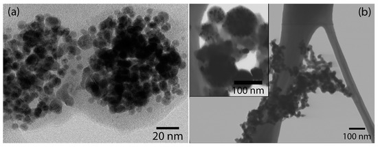 AgNP and CB-PANI.1-1/AgNP were analyzed by electron microscopy. In the high-resolution image, the AgNPs are observed, Figure 4a. As seen, the nanoparticles are spherical with a particle size of the order of 10 nm. Figure 4b portrays the image of the CB-PANI.1-1/AgNP, where the spherical morphology related to the CB particles is maintained (Figure 1a,b). In the inset, a magnified image is illustrated, in which the silver nanoparticles are observed on the core–shell surface as small black particles.