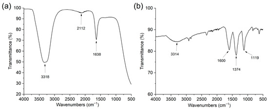 Figure 5a illustrates the infrared spectrum of the silver nanoparticles alone. Three main signals are observed in the spectrum, at 1638, 2112, and 3318 cm−1. These signals are representative of the various interactions of the nanoparticles with the functional groups of the oxidized gallic acid. Consequently, the absorptions correspond to vibrations of OH of phenol (2112 and 3318 cm−1) and carboxylic acid (1638 cm−1) [32]. The interactions of AgNP with gallic acid can be complex; however, studies of such interactions have been carried out for metallic nanoparticles and gallic acid [33].