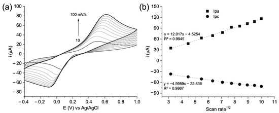 The electroactive areas of AgNP, CB-PANI.1-1, and CB-PANI.1-1/AgNP were determined via cyclic voltammetry measurements. The performance of the electrode was carried out using the system K3[Fe (CN)6]/K4[Fe (CN)6], varying scan rate from 10 to 100 mV s−1. Figure 6a,b show the voltammograms for CB-PANI.1-1 and the plots for anodic and cathodic currents, respectively. The result was subsequently used to calculate the electroactive surface area of the modified electrodes using the Randles–Sevick equation (Equation (1)):