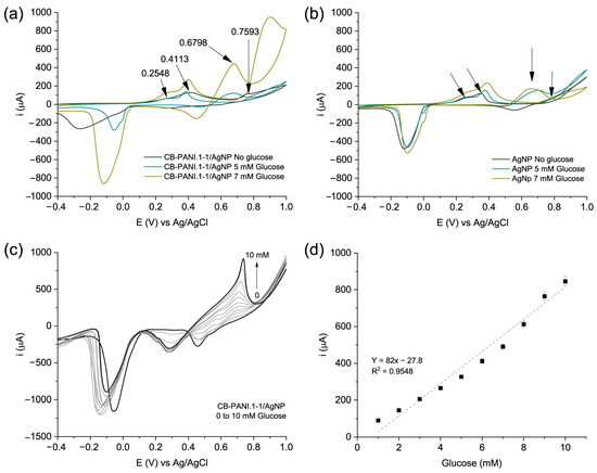 Therefore, based on CV, the current close to 0.7 V could be correlated with glucose concentration, which is corroborated by linear scanning voltammetry (LSV) characterization. Determining the catalytic activity of CB-PANI.1-1/AgNP, varying the glucose concentration from 0 to 10 mM, was carried out via LSV. Figure 7c shows that the current increases proportionally with glucose concentration increment. The performance shown by CV and LSV for glucose detection was quite consistent with linear behavior, which represents an operating advantage of the material since it simplifies glucose quantification. Figure 7d shows the linearity curve of the measurements of current vs. glucose concentration; as noted, the linearity is acceptable with a correlation value R2 of 0.9548 in the range of 1 to 10 mM.
