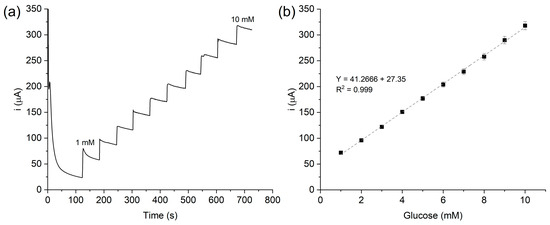 The quantitative evaluation of glucose concentration and the performance of CB-PANI.1-1/AgNP as a sensor of the analyte was evaluated by amperometry with successive additions of glucose with increments of 1 mM. The experiment was evaluated at 0.7 V in optimized conditions (100 mV s−1). Figure 8a shows the plot of i (μA) vs. t (s) and Figure 8b the calculated calibration curve. The peak current at 0.7 V was shown to be a function of glucose concentration, displaying a linear response R2 of 0.999 (3% standard deviation). CB-PANI.1-1/AgNP was evaluated as a sensor with a linear range of detection (LROD) from 1 to 10 mM, a sensitivity of 41.26 µA mM−1 cm−2, and a limit of detection (LOD) of 520 µM (LOD = 3.3 × σ/S, where σ y S are the standard deviation and sensitivity, respectively).